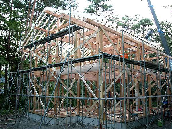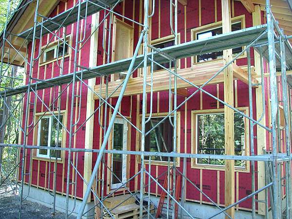 The goal is to build a comfortable, healthy and energy efficient house - with a focus on sustainability and respect towards the local environment - for many decades to enjoy. To achieve this goal we have used new materials which are not known yet in Hakuba. The walls & roof are insulated with wood fiber boards from Switzerland (pavatex), which perform very well in Hakuba's climate. The cavities will be filled with water based spray foam insulation. The triple glazed windows are from Germany and the red stuff you see in some of the photos is a breathable membrane to protect the walls & roof, which are also vented to reduce heat build up and remove moisture. Next week we will install the cladding and continue with the finishing of the interior.